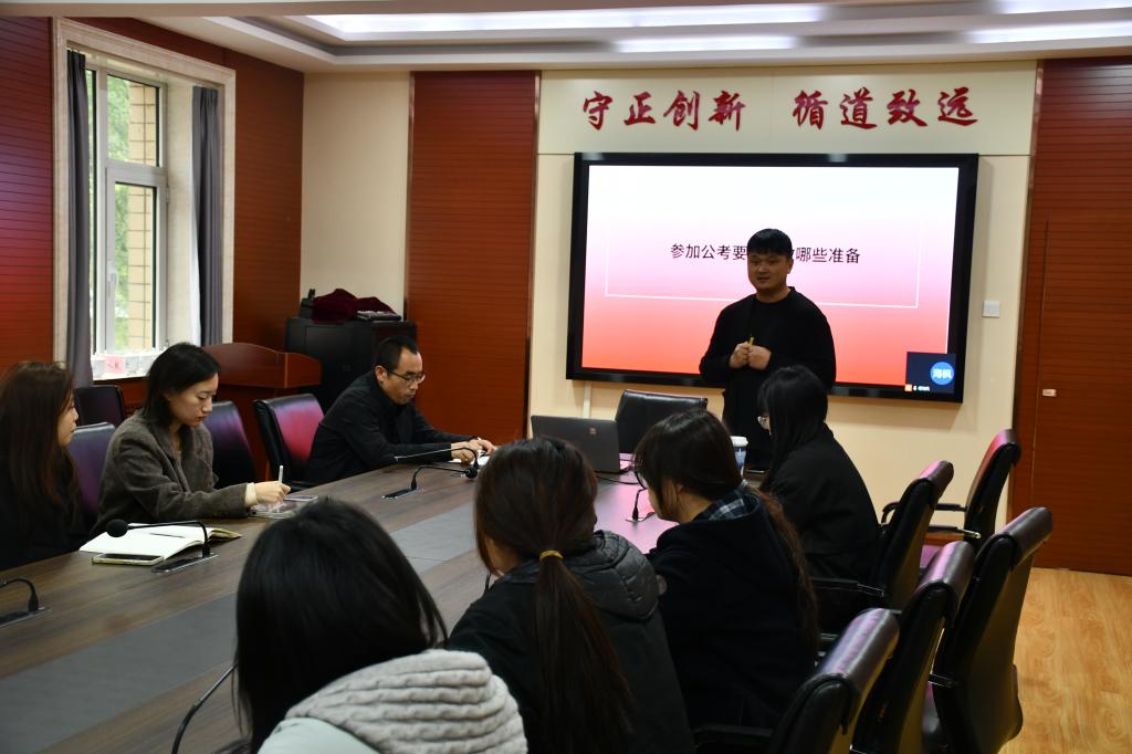 在二办203教室举办公务员考试备考指导讲座。本次讲座特邀中合公考专家担任主讲,围绕国考、省考及选调生等公职类招考进行系统讲解。