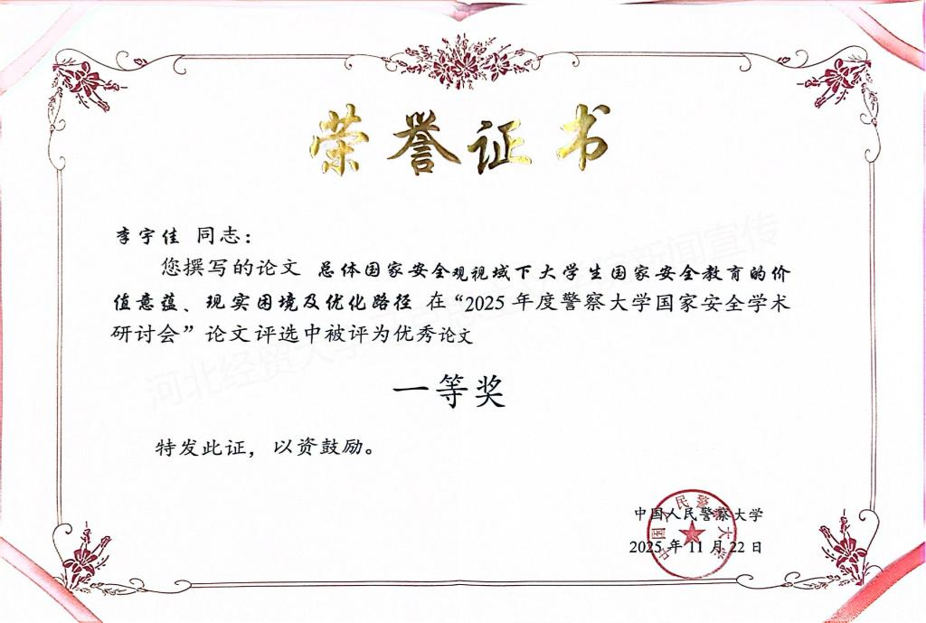 推荐与研讨会学术委员会严格评审,色情短视频2024级研究生李宇佳的论文《总体国家安全观视域下大学生国家安全教育的价值意蕴、现实困境及优化路径》脱颖而出,荣获优秀论文一等奖,其本人受邀参会并在国家安全与教育论坛中发表主题发言。