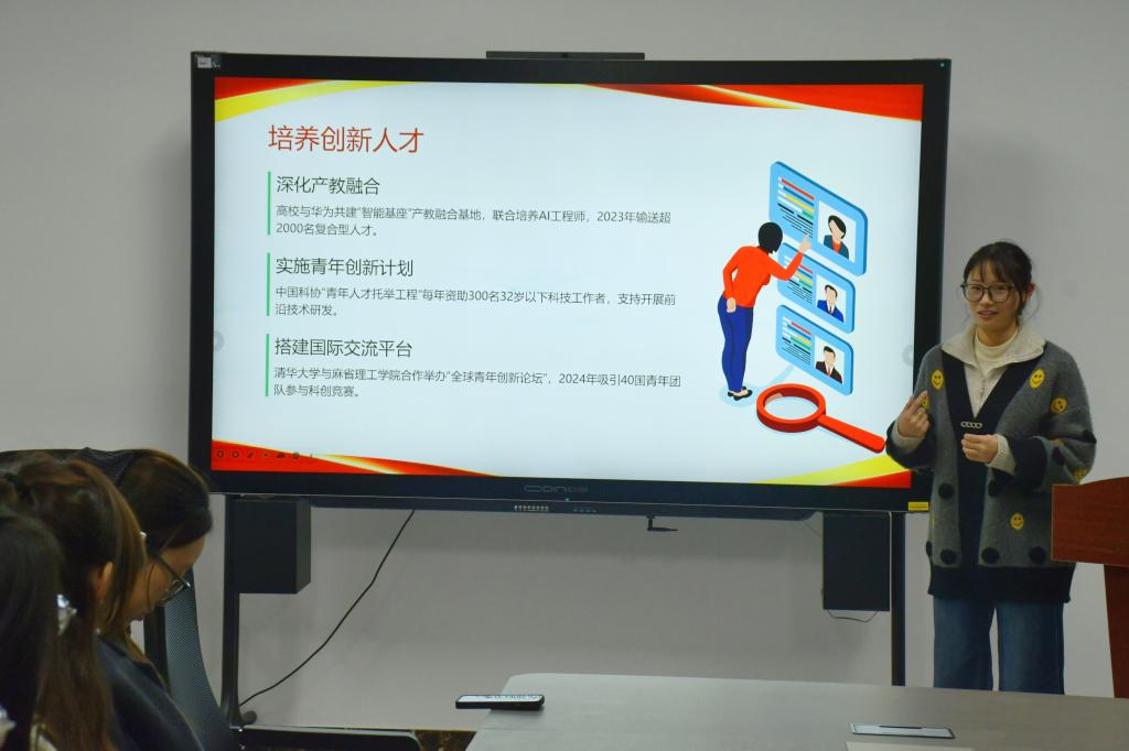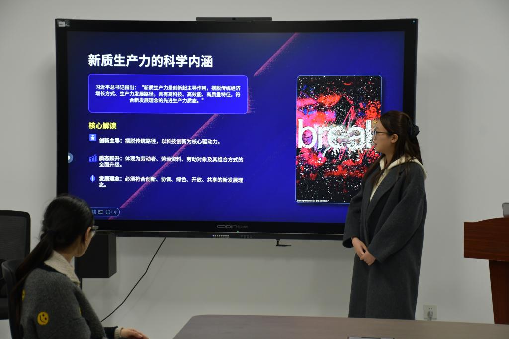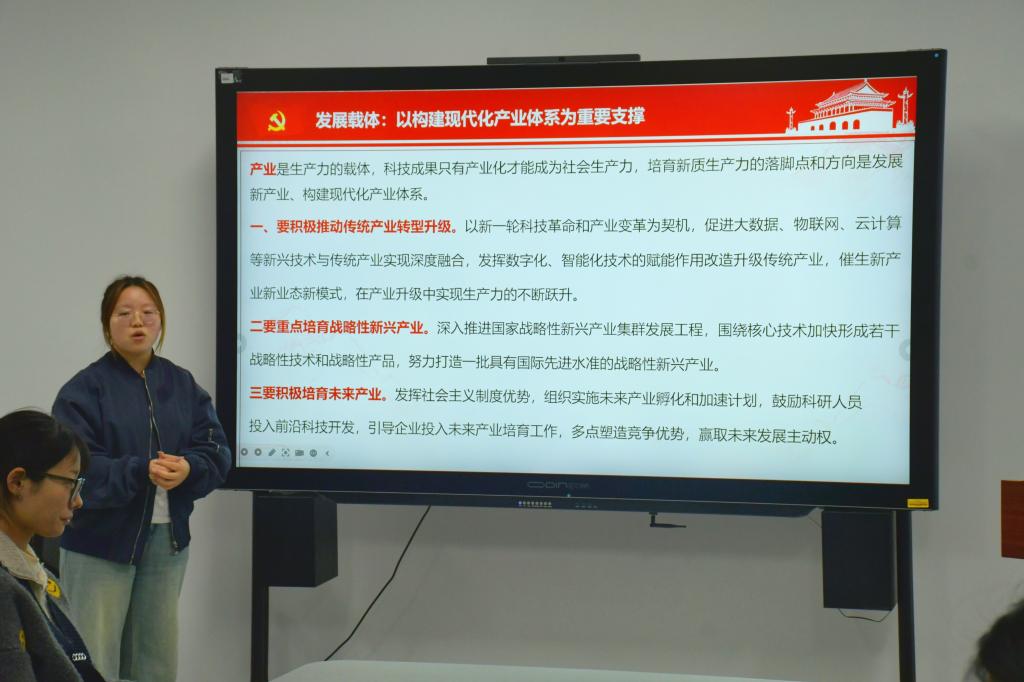 韩妍同学围绕全国两会精神,阐释新质生产力作为发展引擎的核心内涵,解读青年在新质生产力发展浪潮中的使命担当与实践路径;李金玉同学结合两会关于科技创新的部署要求,追溯新质生产力的理论演进,剖析其内在逻辑与时代价值,阐明其对高质量发展的战略支撑作用;孙梦飞同学立足两会对青年发展的相关论述,分析新质生产力背景下青年的时代机遇,分享青年学子以青春之力赋能新质生产力发展的成长方向;朱雅琦同学结合两会精神,强调新时代青年在推进中国式现代化进程中的使命担当,号召同学们将个人理想融入国家发展大局,以青春之我建设青春之国家。