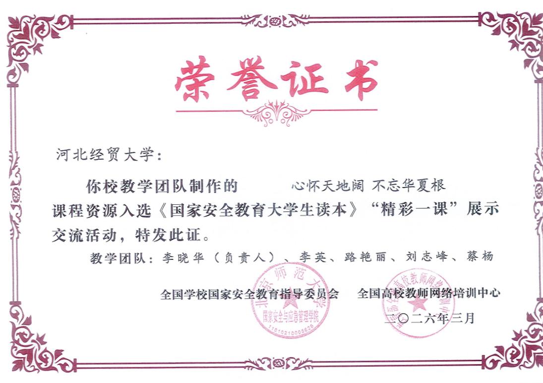 筑牢国家安全防线,我校在行动。近日,由李晓华教授担任负责人,李英、路艳丽、刘志峰、蔡杨等五位教师共同打造的一节课《心怀天地阔 不忘华夏根》,成功入选教育部《国家安全教育大学生读本》“精彩一课”展示交流活动。
